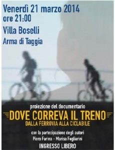 Venerdi 21 marzo 2014 alle ore 21,00, Villa Boselli Arma di Taggia, proiezione del documentario “DOVE PASSAVA IL TRENO” di Piero Farina e Marisa Fogliarini. Organizzazione: GENTE COMUNE.