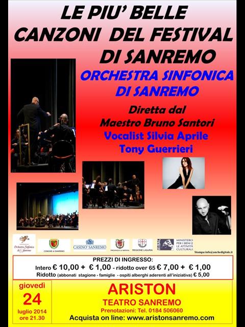 Le più belle canzoni del festival di Sanremo domani giovedì 24 luglio 2014 al Teatro Ariston ” di Sanremo con l’ Orchestra Sinfonica diretta dal Maestro Bruno Santori
