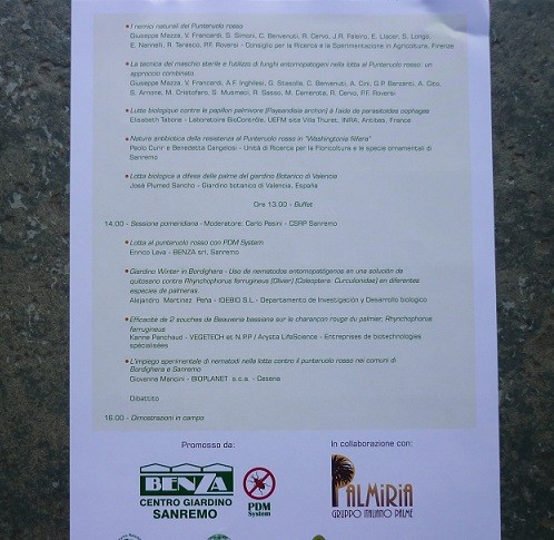 L’appuntamento di Bordighera – spiega Claudio Littardi  del  CSRP – sarà ancora una volta un momento di confronto tra ricerca ed esperienza in campo. Abbiamo invitato i ricercatori di Firenze, Catania e Sanremo, centri molto attivi nella ricerca sui nematodi, per presentare le ultime conoscenze relative dei nemici naturali del punteruolo rosso fino ad oggi individuati e potenzialmente utili per future strategie di controllo biologico. (VEDI ANCHE IL VIDEO)