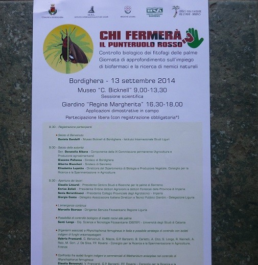 Sabato 13 settembre 2014 a Bordighera presso il Museo Clarence Bicknell, si svolgerà la giornata di approfondimento  sull’impiego di biofarmaci e la ricerca di nemici naturali  dal titolo “Chi fermerà il punteruolo rosso ?”  Ricercatori e tecnici italiani , francesi e e spagnoli si incontreranno nella città delle palme, per esporre e presentare soluzioni “ecologiche” e naturali per contrastare il punteruolo rosso e altri fitofagi.