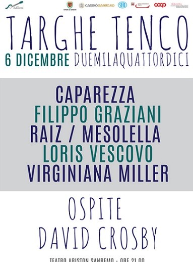 La storia e il carisma di David Crosby, l’estro e l’ironia di Caparezza, la passione e la raffinatezza di Raiz & Fausto Mesolella, la freschezza e la grinta di Filippo Graziani, il rock e la forza dei Virginiana Miller, l’intensità e la ricerca di Loris Vescovo. Si preannuncia come una serata di musica ed emozioni indimenticabili quella del 6 dicembre con la consegna delle Targhe Tenco 2014 e del Premio Tenco a Crosby al Teatro Ariston di Sanremo.