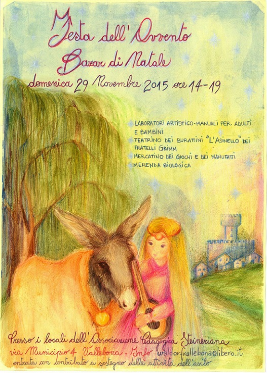Appuntamento divenuto ormai una bellissima abitudine e una tappa fissa e tradizionale nel mese che precede le festività natalizie, sarà lo spunto per offrire innumerevoli e uniche opportunità per chi è alla ricerca di un regalo natalizio originale e inusuale nel suggestivo mercatino dei giochi e dei manufatti: bambole di lana e stoffe fatte a mano, giocattoli di legno, cere per disegnare e modellare, calendari dell’Avvento, libri ed altro ancora oppure semplicemente per scegliere di trascorrere un pomeriggio diverso dal solito, dedicandosi ai laboratori artistico-manuali, sia per adulti che per bambini, lasciandosi incantare ed affascinare dalla toccante fiaba, allestita nel teatrino dei burattini – quest’anno sarà la volta de “L’asinello” dei fratelli Grimm – tentando la “fortuna” alla Pesca delle meraviglie, facendo una piccola pausa gastronomica con la merenda biologica e semmai chiedere, se interessati, qualche informazione in più sulla pedagogia steineriana.