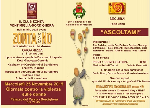 Bordighera News GIORNATA CONTRO LA VIOLENZA SULLE DONNE 10 Novembre 201510 Novembre 2015 admin Mercoledì 25 novembre 2015  ore 20,45 al Palazzo del Parco di Bordighera avrà luogo un convegno dedicato al tema  della violenza sulle donne. Organizzazione a cura  del CLUB ZONTA VENTIMIGLIA-BORDIGHERA La redazione
