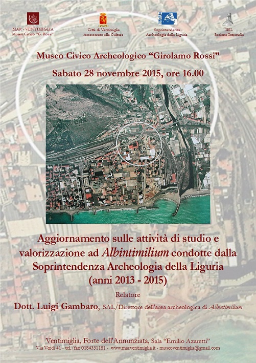 Sabato 28 novembre alle ore 16.00 nella Sala “Emilio Azaretti” del Museo Civico Archeologico “Girolamo Rossi” di Ventimiglia il dottor Luigi Gambaro, funzionario-archeologo della Soprintendenza Archeologia della Liguria e Direttore dell’area archeologica di Ventimiglia, interverrà su Aggiornamento sulle attività di studio e valorizzazione ad Albintimilium condotte dalla Soprintendenza Archeologia della Liguria (anni 2013 – 2015), in cui si delineeranno i risultati degli ultimi anni di ricerca nell’area archeologica ventimigliese. Grazie anche a una videoproiezione sarà possibile scoprire gli interventi, voluti dal MIBACT, di restauro, consolidamento, valorizzazione e studio diretti dalla Soprintendenza Archeologia della Liguria nell’area del teatro e delle terme di Albintimilium, a cui hanno anche partecipato gli archeologi dell’IISL guidati da Daniela Gandolfi.
