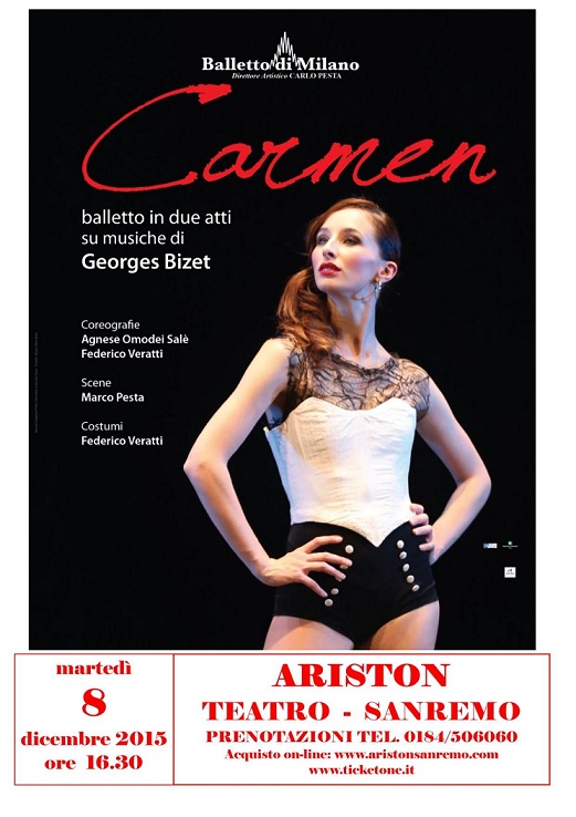 Balletto su musiche di Georges Bizet Liberamente ispirato all’omonima novella di Prosper Mérimée e all’opera di Georges Bizet Coreografie Agnese Omodei Salè – Federico Veratti Costumi Federico Veratti – Scene Marco Pesta Poche opere hanno avuto tanta fortuna come la Carmen di Bizet, un capolavoro che ha visto numerose riletture in forme artistiche diverse dalla lirica: cinema, musical, danza. Il Balletto di Milano ne presenta una nuova versione, ispirata alla novella di Prosper Mérimée e all’omonima opera di Bizet, che apre a nuove interpretazioni senza tradire la tradizione ed avvalendosi di una modernizzazione della messa in scena e stile.