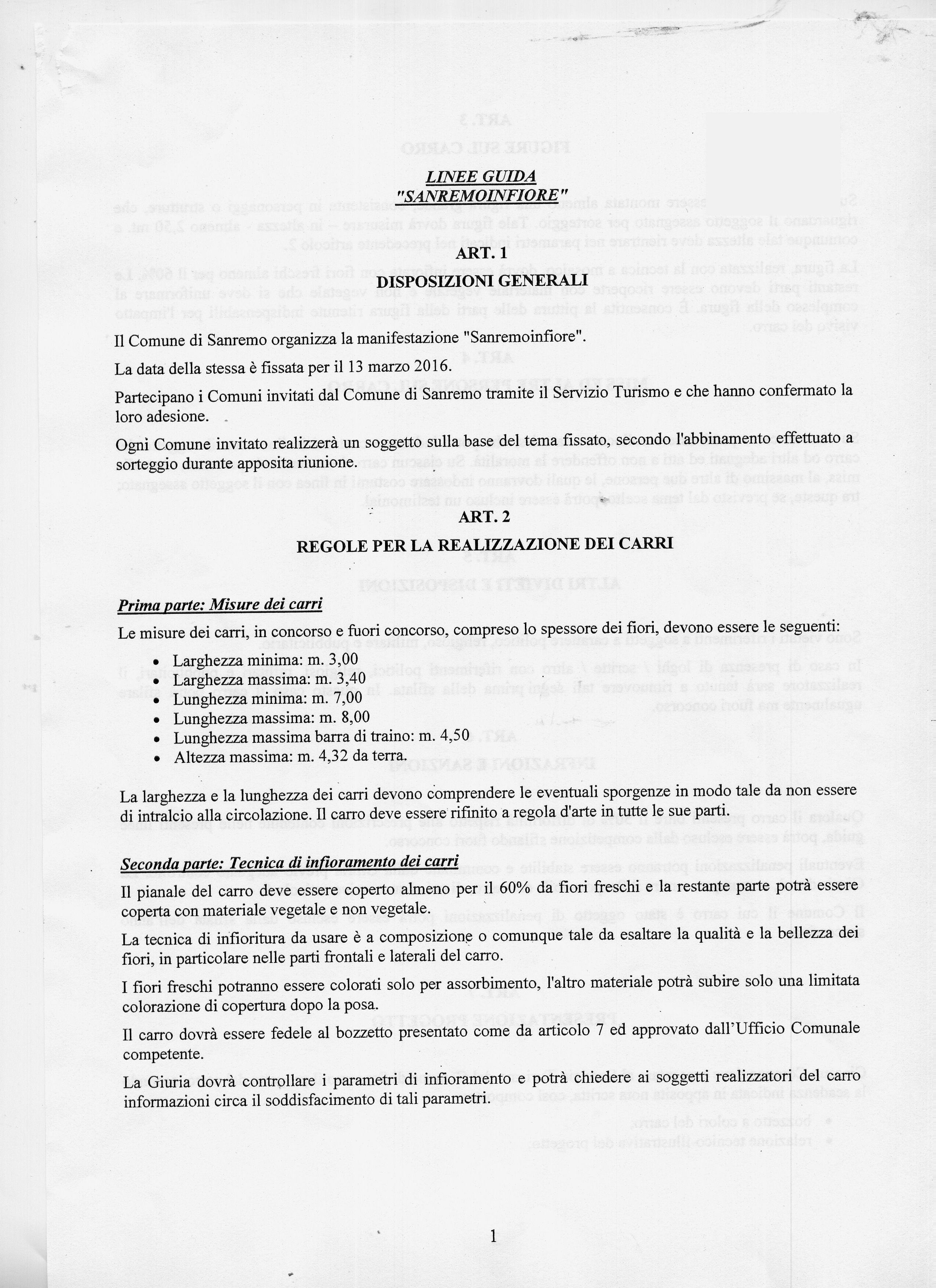 La sfilata avverrà il 13 marzo 2016. Il tema di quest’anno è “Il Mondo delle Fiabe”. Chi riceverà l’incarico di predisporre il carro fiorito della Città di Bordighera ha diritto a ricevere un finanziamento di Euro 9.000 appositamente stanziato dal Comune di Sanremo, integrato da un contributo di Euro 3.000 stanziato dal Comune di Bordighera.