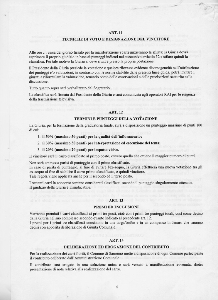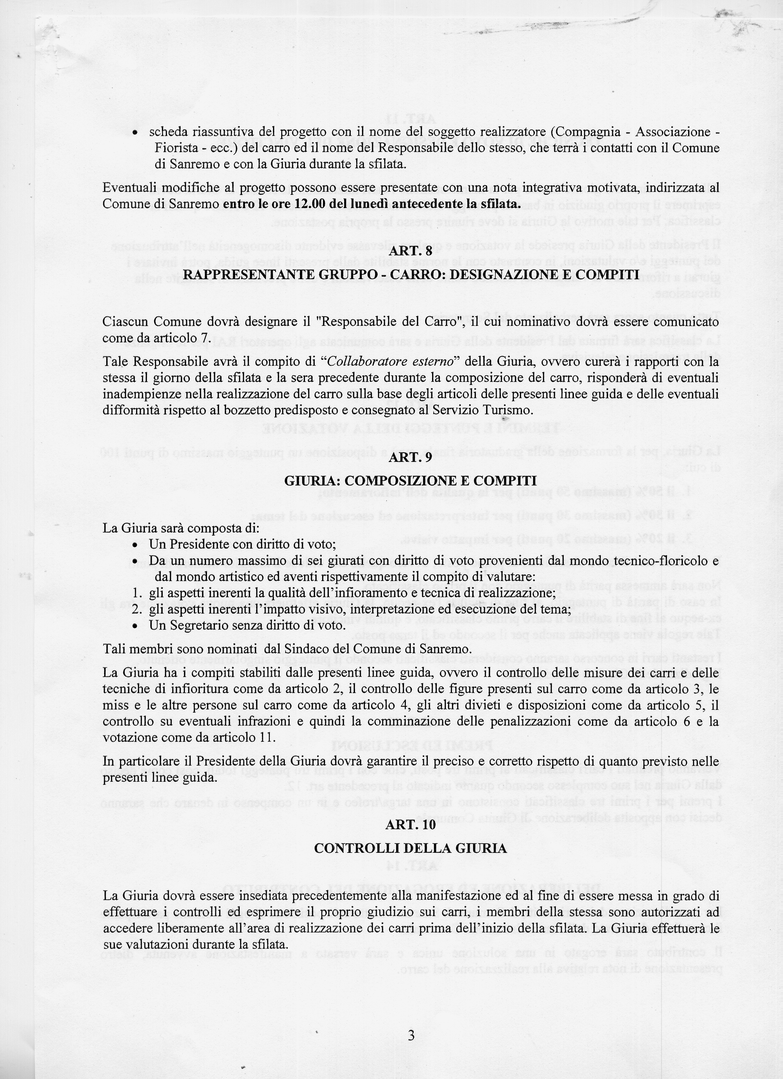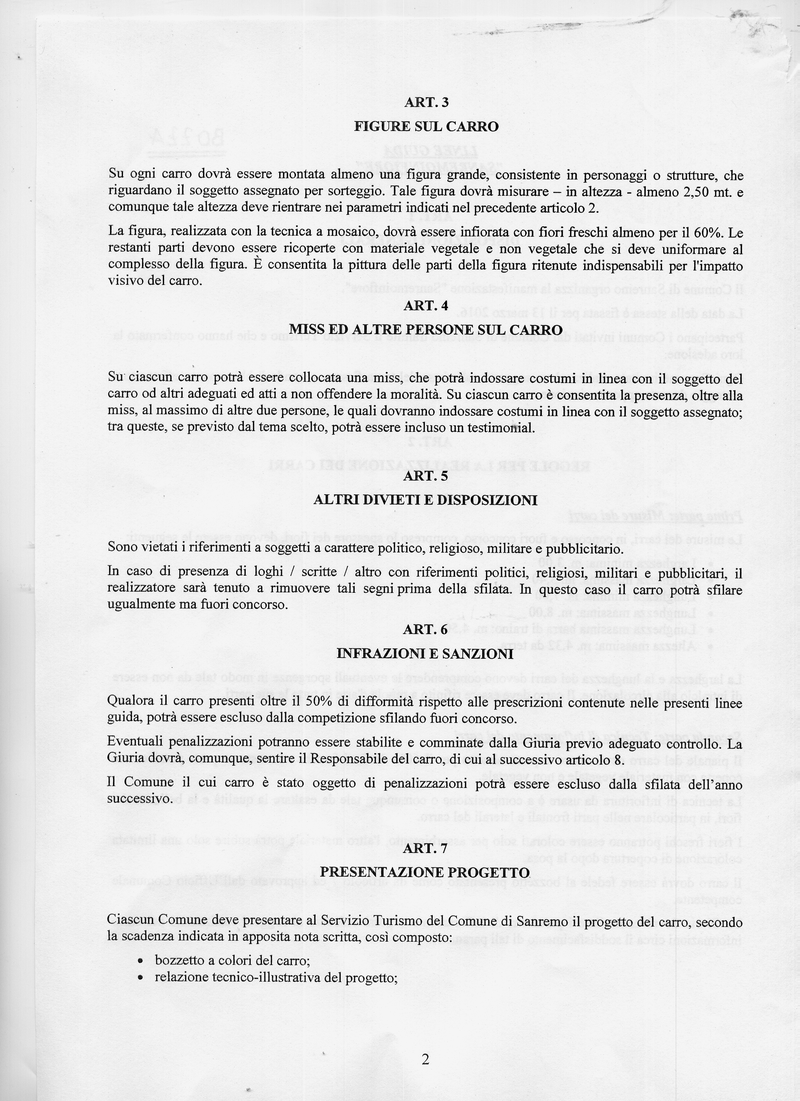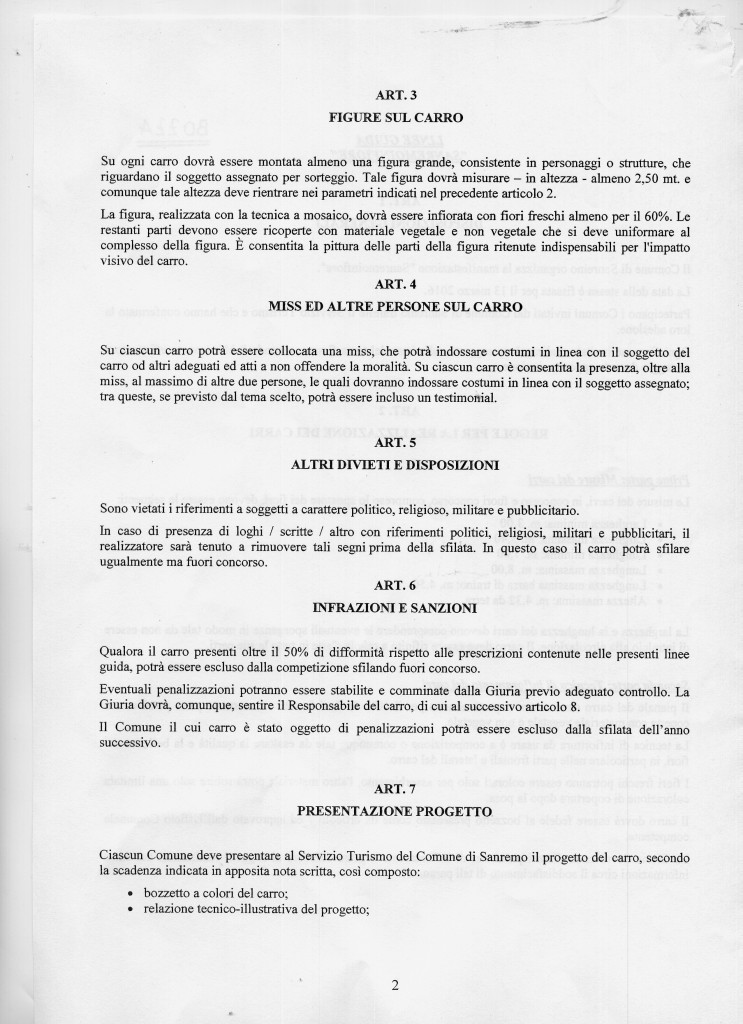 Nell’ambito di queste indicazioni viene lasciato ampio spazio agli autori affinché sviluppino il più possibile in libertà la loro fantasia.Per la preparazione del carro è stato redatto un regolamento (in allegato). Così come in questa stessa pagina trovate il file con l’indicazione del percorso. Ad ogni e-mail ricevuta all’indirizzo cultura@bordigherra.it entro il termine sopra citato sarà inviata una risposta di conferma, che vale come ricevuta dell’effettiva ricezione del vostro invio; pertanto in assenza di una e-mail di conferma contattare l’ufficio cultura allo 0184 272205 anche per eventuali altre informazioni.