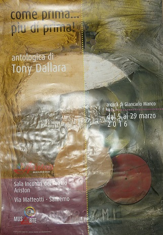 News Sanremo “COME PRIMA PIU’ DI PRIMA” ANTOLOGIA DI TONY DALLARA 28 Febbraio 201628 Febbraio 2016 admin Il Teatro Ariston ospita la Mostra di Pittura “COME PRIMA PIU’ DI PRIMA” antologia di Tony Dallara. La mostra sarà aperta dal 5 al 29 marzo 2016 presso la Sala Incontri del Centro Ariston. Organizzazione a cura di Giancarlo Manco.