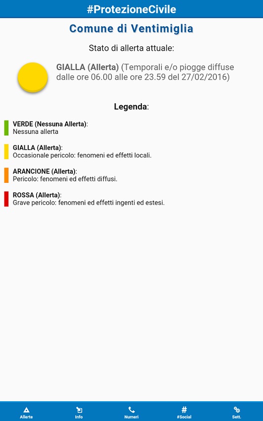 Dalle ore 06:00 del 27/02/2016 alle ore 23:59 del 27/02/2016 nella nostra zona è prevista allerta idrogeologica/idraulica gialla per piogge diffuse/ temporali. L’allerta gialla è il primo livello di allerta, tuttavia è bene ricordare che localizzazione e  tempistica dei fenomeni temporaleschi sono fattori impossibili da determinare nel dettaglio con un sufficiente anticipo: il quadro generale tracciato dai bollettini di previsione, quindi, va sempre integrato con le osservazioni in tempo reale e a livello locale. A tal proposito si invita la cittadinanza a scaricare la nuova app della Protezione Civile del Comune di Ventimiglia, ultima iniziativa dell’Amministrazione Ioculano fortemente voluta dall’Assessore Gabriele Campagna: con questo strumento potrete avere in tempo reale tutte le informazioni sull’allerta meteo aggiornate sulla nostra città .
