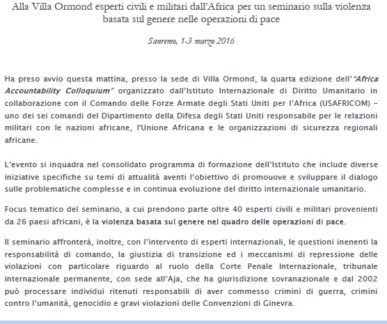 SEMINARIO SULLA VIOLENZA NELLE OPERAZIONI DI PACE