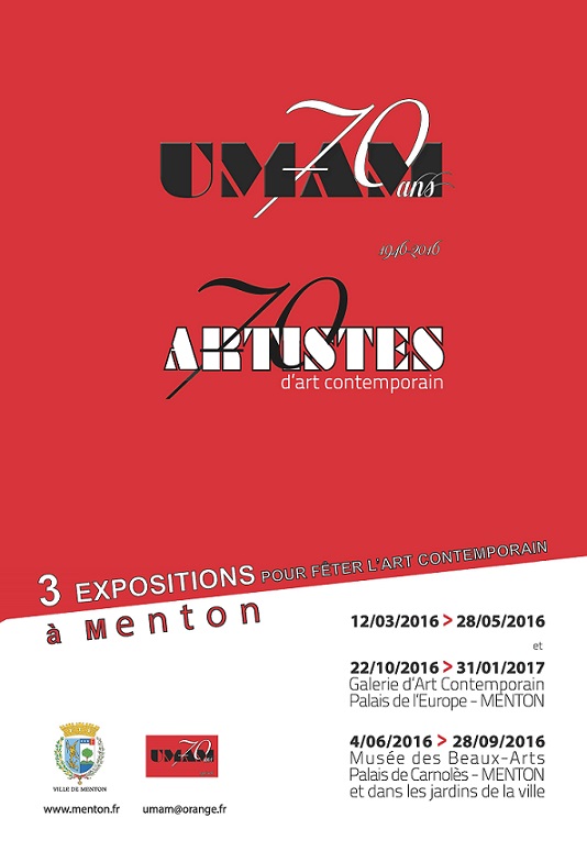 La Ville de Menton et l’UMAM organisent, pour les 70 ans de l’association, trois expositions d’art contemporain à Menton entre le 12 mars 2016 et le 31 janvier 2017. Différents lieux accueilleront des artistes méditerranéens choisis avec soin : les jardins de la ville, le musée des Beaux-Arts du Palais de Carnolès, le parvis du Musée Jean Cocteau collection Séverin Wunderman mais surtout l’emblématique Palais de l’Europe, ancien théâtre des Biennales de Menton. Les liens de Menton avec l’art contemporain sont forts et anciens. Au lendemain de la Seconde Guerre mondiale, Menton, ville meurtrie, travaille à sa reconstruction et tente de relancer son économie touristique mise à mal par tant d’années de conflit. La Biennale Internationale d’Art de Menton fut l’une des grandes amorces de cette reconquête. Lancée en 1951, la Biennale de Menton regroupe pour la première fois les artistes méditerranéens d’art contemporain. Elle demeura, durant ses 30 ans d’existence, un événement majeur dans le monde de l’Art et de la Culture. Ainsi jusqu’en 1980, des artistes sélectionnés parmi les plus prometteurs du moment, purent exposer leurs oeuvres aux côtés de grands Maîtres, Dufy, Rouault, Matisse, Villon, Braque, Picasso, Chagall, Dali, Delvaux, attirant sur la ville le regard averti des grands noms de cette époque ( Les Biennales internationales d’art de Menton, Catalogue, Archives Municipales de Menton). En 2016, Menton renoue ainsi avec l’art contemporain en célébrant les 70 ans de cette belle association.