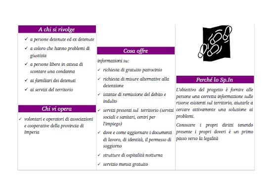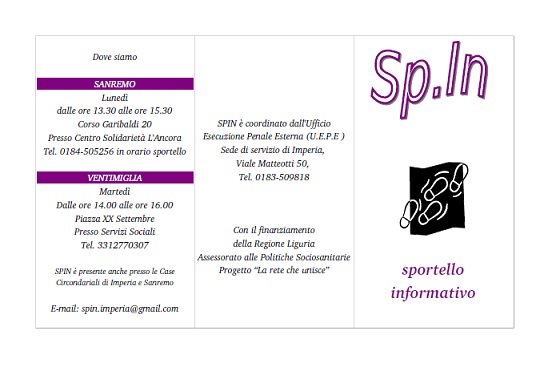 Gli sportelli SPIN sono coordinati dall’Ufficio Esecuzione Penale Esterna (U.E.P.E ) e collaborano alla loro realizzazione le associazioni ARCI, Centro di solidarietà L’Ancora, Associazione Mappamondo e ACAT Sanremo