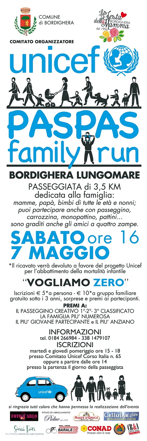 Iscrizioni Euro 5.00 a persona; Euro 10.00 a gruppo familiare. Gratuito fino a tre anni. Sorprese e premi ai partecipanti. Sarà premiato il passeggino più creativo (1°, 2° e 3°); la famiglia più numerosa e il più anziano e giovane partecipante. Informazioni ed iscrizioni tel. 0184266984 – 3381479107 “Vogliamo zero”. Il ricavato sarà devoluto a favore del Progetto Unicef per l’abbattimento della mortalità infantile.