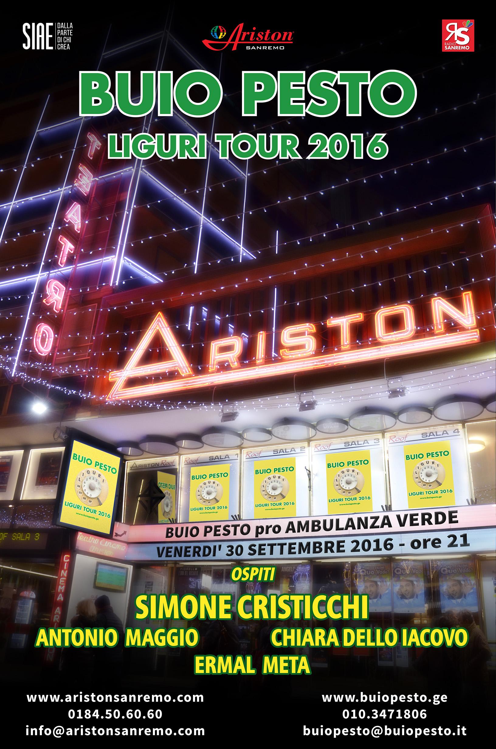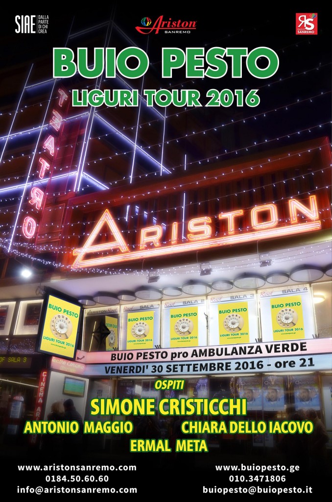 Il live conclusivo della fortunata tournée estiva della rock band dialettale ligure, che li ha portati nelle piazze di tutta la regione davanti a migliaia di spettatori, si svolgerà Venerdì 30 Settembre alle ore 21.00, organizzato dal Teatro Ariston con il patrocinio della SIAE e, ancora una volta, servirà a raccogliere fondi per il progetto “Ambulanza Verde”, dedicato all’acquisto di mezzi di soccorso e attrezzature per le Pubbliche Assistenze della Liguria. Il netto dell’incasso sarà devoluto alla Croce Verde Intemelia di Ventimiglia, a favore della quale i Buio Pesto hanno già raccolto fondi per acquisto di un’automedica nel 2014, con la collaborazione della Nazionale Italiana Cantanti.