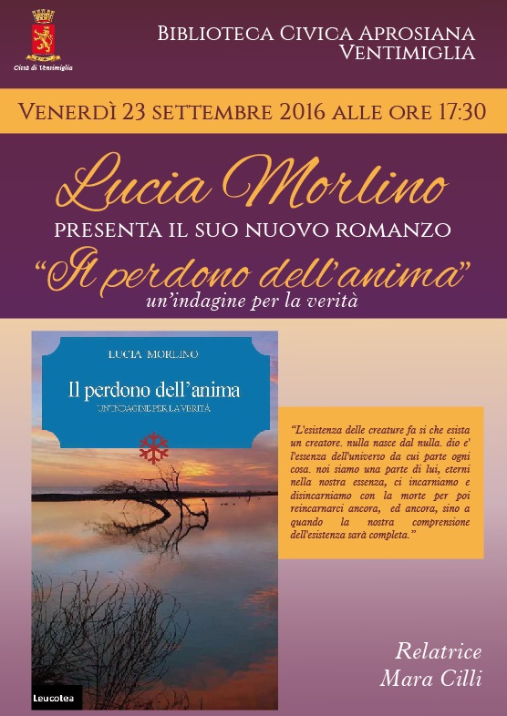 Presentazione del romanzo “Il perdono dell’anima” di Lucia Morlino edizioni Leucotea presso la Biblioteca Civica Aprosiana  di Ventimiglia.