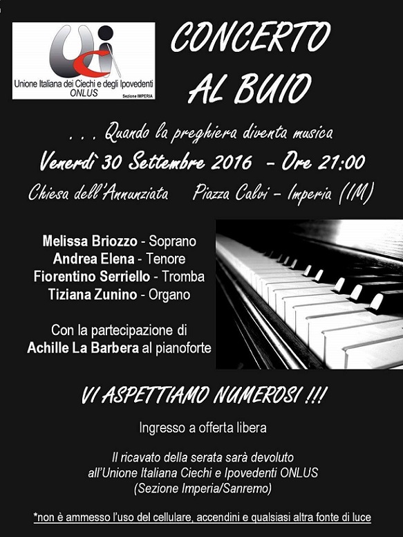 Altre Città Imperia IMPERIA – CONCERTO AL BUIO 19 Settembre 2016 admin VENERDI’ 30 SETTEMBRE 2016 – ORE 21:00 CHIESA DELL’ANNUNZIATA