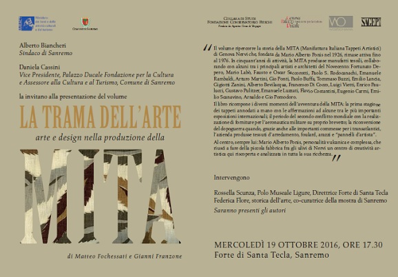 La mostra al Museo di Santa Tecla ha riscosso un notevole successo di pubblico con i suoi 13700 visitatori complessivi, 800 nella sola giornata organizzata dal Fai, questo è stato uno dei motivi per cui si è realizzato un catalogo di presentazione: “La Trama Dell’Arte – arte e design nella produzione della Mita”. Domani mercoledì 19 ottobre 2016 alle ore 17,30 sarà presentato il volume al Forte di Santa Tecla alla presenza degli Autori Matteo Fochessati e Gianni Franzone. Saranno presenti inoltre l’architetto del Polo Museale ligure Dott.ssa Rossella Scunza, la curatrice della sezione sanremese Dott.ssa Federica Flore e Mitchell Wolfson jr. collezionista e Mecenate. B.M.