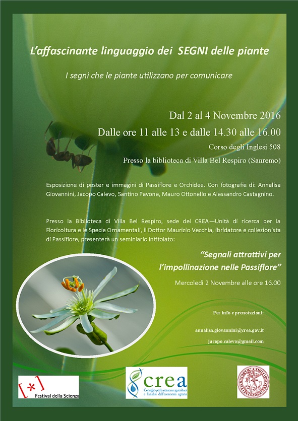 Inoltre, il giorno 2 novembre, alle ore 16, il Dott. Maurizio Vecchia, responsabile della collezione Nazionale di Passiflore, certificata dalla Società Botanica Italiana, terrà un seminario intitolato “Segnali attrattivi per l’impollinazione nelle Passiflore“.