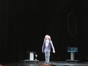 Un monologo brillante, di ironici giochi di parole che fanno riflettere, un flusso di coscienza magnetico che tiene lo spettatore continuamente sospeso e coinvolto in un turbine di significato e significante.