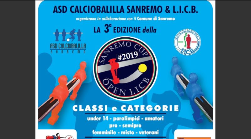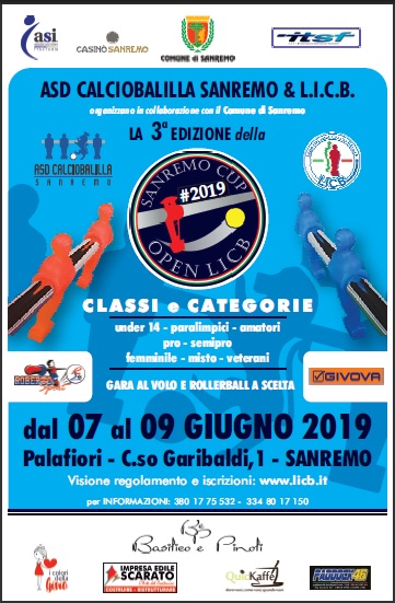 I giorni 7, 8 e 9 GIUGNO 2019, A.s.d. Calciobalilla Sanremo, in collaborazione con La Lega Italiana Calciobalilla (L.I.C.B.) e patrocinata da Comune di Sanremo e Casinò, organizza al Palafiori di corso Garibaldi