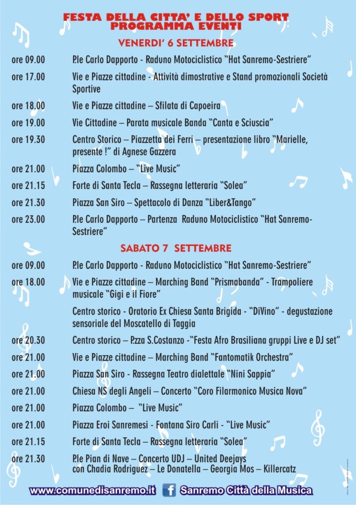 Il via venerdì 6 settembre con le attività dimostrative e lo stand promozionale delle 33 società sportive che ringrazio per aver accolto il nostro invito a partecipare e per averci accompagnato in queste settimane, guidate dai Consiglieri comunali Giuseppe Faraldi e Simona Moraglia, al fine di delineare il programma al meglio. Abbiamo riscontrato tanto entusiasmo e di questo siamo davvero felici. Un ringraziamento al Casinò che, ancora una volta, ha dimostrato disponibilità a realizzare in collaborazione con il Comune un concerto, quello di sabato 7 settembre a Pian di Nave, destinato ad un pubblico giovane. E grazie ai nostri uffici per il lavoro e l’impegno. A tutti auguro una buona festa della città!”.