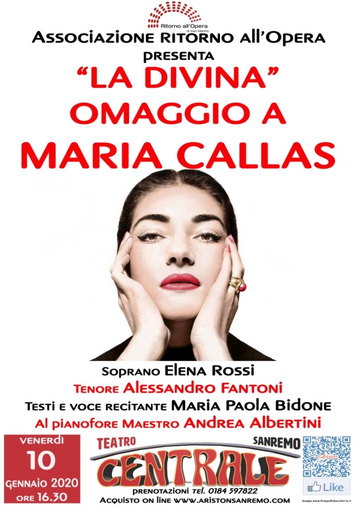 L’Omaggio a Maria Callas, organizzato dall’Associazione “Ritorno all’opera”, che si terrà al Teatro Centrale di Sanremo il 10 gennaio 2020, alle ore 16.30, nasce proprio dalla precisa volontà di ricordare la più grande interprete di tutti i tempi, sottrarla all’oblio e, in qualche modo, rimediare al torto fattole da un mondo continuamente alla ricerca di spettacolarità e novità che sembra averne dimenticato la grandezza.