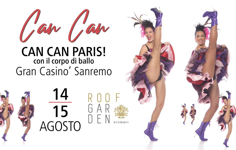 Il 14 e il 15 agosto il Corpo di ballo “Gran Casino’ Sanremo” trascinerà il pubblico del Roof Garden in un coinvolgente Can Can Paris che sprigionerà la più sfrenata allegria sulle note e sullo spirito del mitico Moulin Rouge. Un’invasione di ballerine, splendide ragazze, che valorizzano i costumi da avanspettacolo per rivivere le celebri atmosfere dei cabaret e del Can Can parigino.