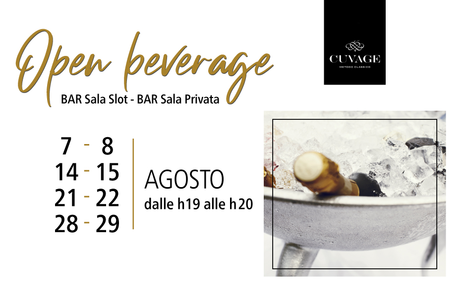 Tutti i venerdì e sabato del mese di agosto dalle ore 19.00 alle ore 20.00 si terrà l’Open Beverage nei bar di sala Slot e sala Privata a cura di Cuvage.
