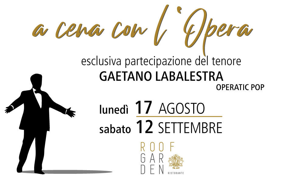 Lunedì 17 agosto “A Cena con l’Opera” propone musica d’autore nell’intensa espressione vocale del tenore Gaetano Labalestra, interprete possente e apprezzato che traducerà il pathos di alcuni brani più famosi ed amati del repertorio operistico mondiale. A cena con l’Opera ritornerà sabato 12 settembre sempre con l’esclusiva partecipazione del tenore Gaetano Labalestra.