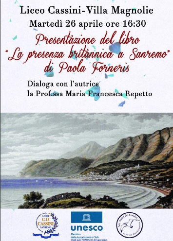 Il Club per l’Unesco di Sanremo e l’Associazione Amici del Cassini propongono alla cittadinanza la presentazione del libro “La presenza britannica a Sanremo” di Paola Forneris. L’incontro avverrà presso l’aula magna del Liceo Cassini a Villa Magnolie, via Magnolie 6, martedì 26 Aprile alle ore 16,30.