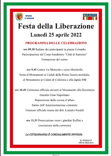Lunedì 25 aprile il Comune di Sanremo aderisce alle celebrazioni per la “Festa della Liberazione” con il seguente programma: