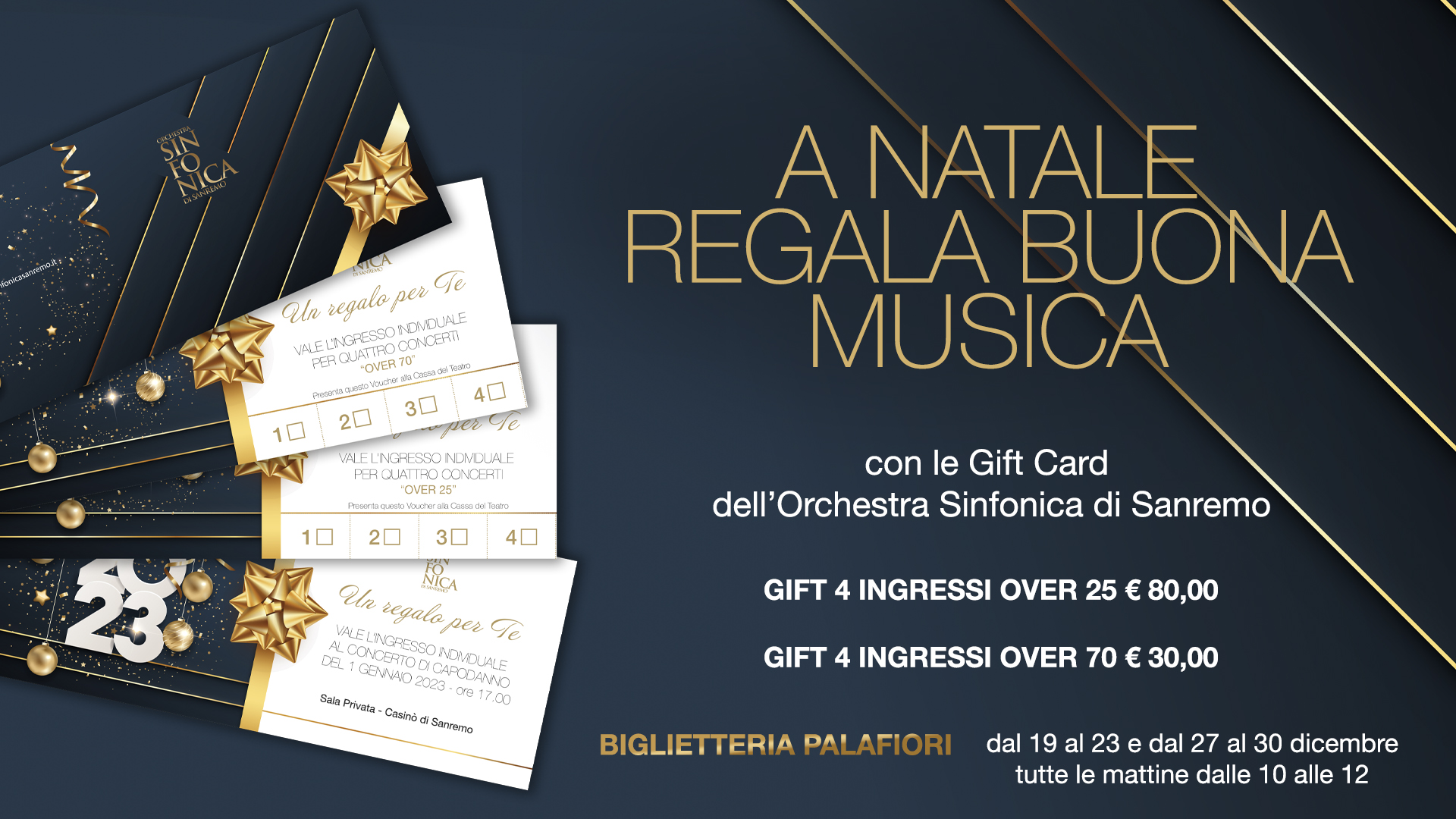 La Fondazione Orchestra Sinfonica di Sanremo ha attivato la speciale ed elegante gift card per regalare 4 ingressi ad un prezzo speciale: 80 euro per gli over 25, 30 euro per gli over 70.