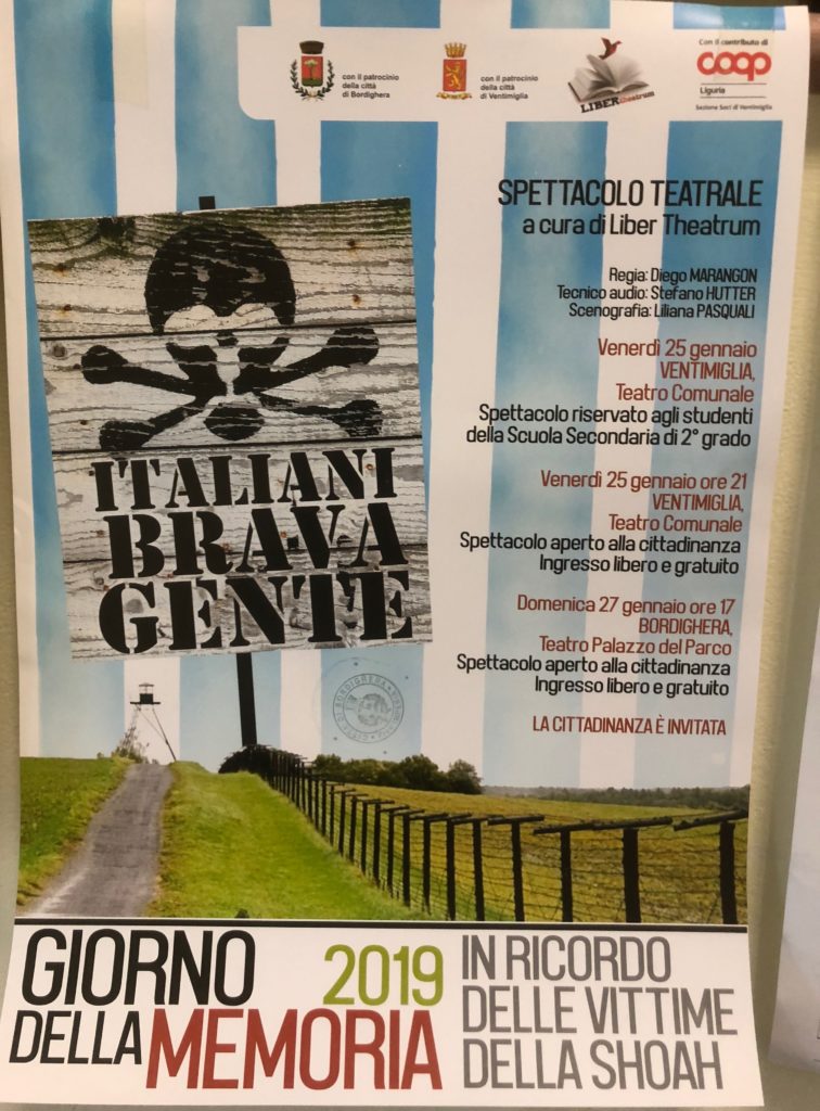 Ebrei stranieri nella Riviera di Ponente 1938-1940, alla luce di nuovi ritrovamenti”. Interventi musicali con Simona Betti (danze) e Shalom Aleijem (canti tradizionali). Special Guest la cantante Paola Melato. Gli interventi musicali sono a cura dell’Associazione AEC la cui attività si fonda sul rispetto della dignità umana, vista in tutte le sue stupende diversità, per una giusta e rispettosa convivenza. Inoltre, il Comune di Bordighera propone per domenica 27 gennaio, Palazzo del Parco alle ore 17.00, a cura dell’Associazione Liber Theatrum: “Italiani brava gente” con la regia di Diego Marangon. Si dice: “Italiani brava gente”; ma è sempre stato così? Un viaggio a ritroso nella storia d’Italia per capire e scoprire cosa successe nel nostro Paese all’indomani della promulgazione delle leggi razziali nel settembre del 1938, tra indifferenza e complicità. Tutte le iniziative previste per la Giornata della Memoria sono ad ingresso libero.