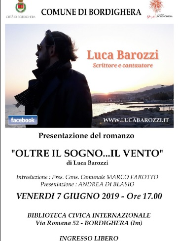 Venerdì 7 giugno 2019 alle ore 17,00 presso la Biblioteca Civica Internazionale di Bordighera, sarà presentato il libro “Oltre il sogno…il vento” di Luca Barozzi.