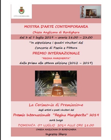 Da mercoledì 3 a domenica 7 luglio, Chiesa Anglicana, dalle 18.00 alle 23.00, l’Accademia Delle Muse di Bordighera, con il patrocinio del Comune di Bordighera, presenta: Mostra Arte Contemporanea/Poesia/Prosa/Artisti (vincitori edizioni precedenti) del Concorso “Premio Internazionale Regina Margherita”. La cerimonia di premiazione Artisti e poeti dell’ottava edizione 2019 – Premio Internazionale Poesia/Pittura “Regina Margherita” avrà luogo domenica 7 luglio 2019 alle ore 18,00 sempre in Chiesa Anglicana.