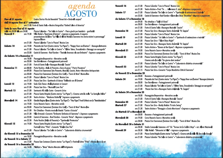 E’ pubblicata sulla pagina facebook Sanremo Città della Musicaed è scaricabile anche dal sito istituzionale del Comune di Sanremo www.comunedisanremo.it l’agenda degli eventi di agosto e settembre organizzati dall’Assessorato al turismo (qui allegata).