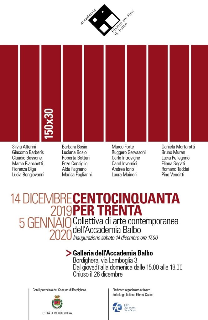 La Collettiva dell’Accademia G. Balbo “Centocinquanta per trenta” continua nelle sale dell’Accademia sino al 5 gennaio 2020 in Via Lamboglia 3 a Bordighera.
