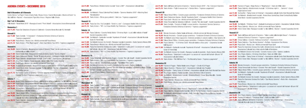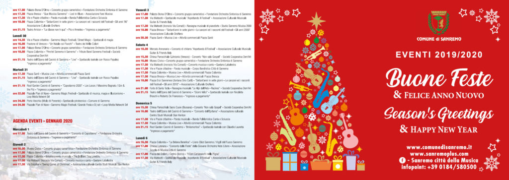 Di seguito l’agenda degli eventi che si trova anche sul sito istituzionale www.comunedisanremo.it