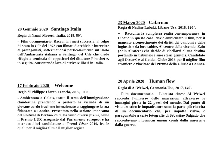 L’evento è composto da quattro film con due proiezioni giornaliere per ciascun film, ore 15,30 e ore 21,00 sempre di lunedi.