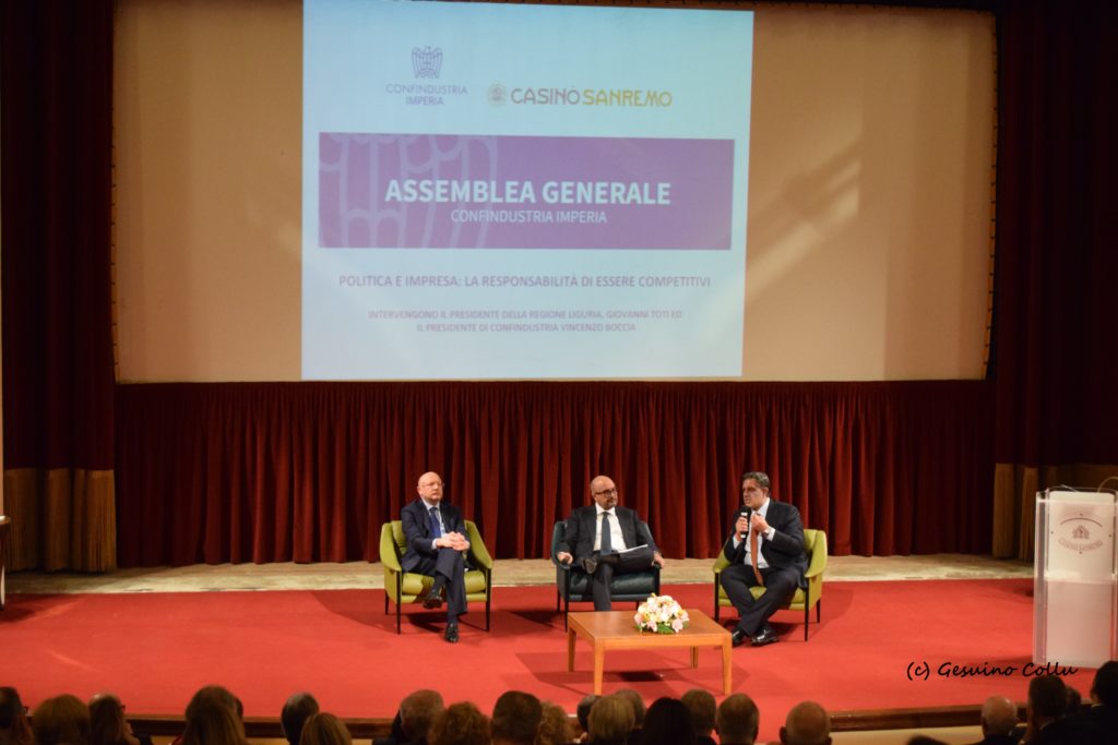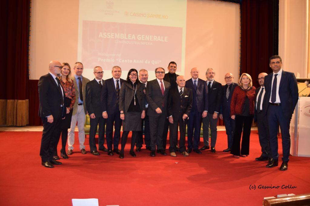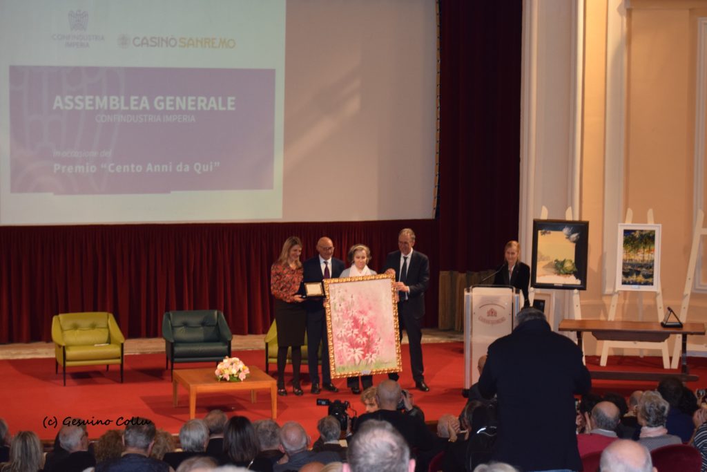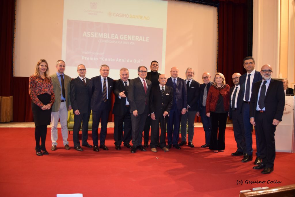 Giovedì 9 gennaio 2020, alle ore 17.00 nel Teatro dell’Opera del Casinò di Sanremo, si è svolta la cerimonia di consegna del Premio Casinò di Sanremo-Confindustria Imperia “Cento Anni da Quì” 2019. All’evento ha partecipato il Presidente nazionale di Confindustria dott. Vincenzo Boccia e il dott. Gennaro Sangiuliano, Direttore del TG2, il dott. Giovanni Toti Presidente della Regione Liguria e il Sindaco di Sanremo Alberto Biancheri.
