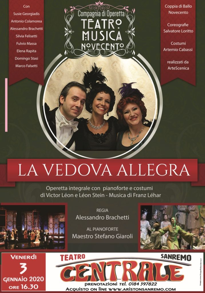 Venerdì 03 gennaio 2020 alle ore 16,30 nel Teatro Centrale di Sanremo, l’Associazione Ritorno all’Opera presenta “La vedova Allegra” operetta integrale con pianoforte e costumi di Victor Leon e Leon Stein – Musica di Franz Lehar al pianoforte MAestro Stefano Giaroli con Susie Georgiadis, Antonio Colamorea, Alessandro Brachetti, Silvia Felisetti, Fulvio MAssa, Elena Rapita, Domingo Stasi e Marco Falsetti.