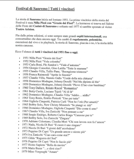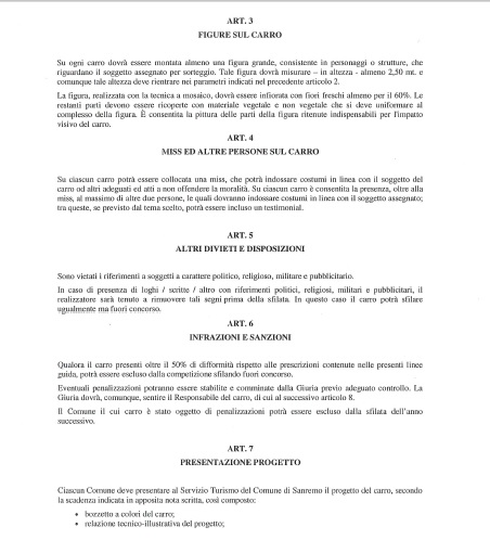 Chi desidera partecipare alla manifestazione in oggetto deve far pervenire entro e non oltre giovedì 6 febbraio ore 10.00 all’indirizzo lucamoreno2017@gmail.com un bozzetto con relazione descrittiva. Nel progetto si deve trovare sia l’elemento distintivo della città ovvero lo stemma e il nostro brand (che potete vedere in allegato) e ovviamente gli elementi relativi al tema della rassegna. Per aiutarvi in allegato trovate l’elenco di tutte le canzoni vincitrici del Festival di Sanremo. Attenzione: contestualmente all’invio del bozzetto dovrà essere indicato oltre alla relazione descrittiva anche la tipologia e il numero dei fiori utilizzati; nominativo del responsabile del carro e suo numero di cellulare; nominativi del personale impegnato all’allestimento ed infioritura del carro nell’autostazione di Piazza Colombo (massimo 25 persone); nominativi del personale che accompagnerà il carro durante la sfilata (massimo 6 persone) nonché i riferimenti dei figuranti che saliranno sul carro, secondo quanto stabilito dall’art. 4 del regolamento; disposizione di personale per la guida del trattore trainante il carro (in caso negativo l’autista per il trattore verrà reperito dal Comune di Sanremo, ma in questo caso occorrerà esplicitamente dichiarare l’indisponibilità alla guida) e comunque seguire quanto indicato nel documento allegato denominato “Istruzioni”.