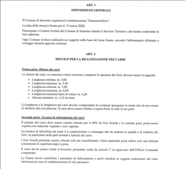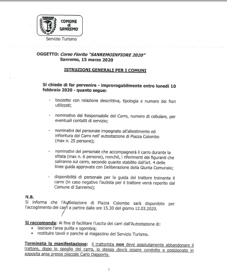 Come ogni anno il Comune di Sanremo organizza il Corso Fiorito “Sanremoinfiore” Edizione 2020. Anche la città di Bordighera parteciperà con un proprio carro fiorito (prot. n. 2363 del 28.1.2020). La sfilata avverrà domenica 15 marzo 2020 con inizio alle ore 10.30. Il tema di quest’anno è “70 anni e non sentirli…i fiori cantano Sanremo”. Al primo classificato il Comune di Sanremo consegnerà un premio di Euro 3.000; al secondo Euro 2.000 e al terzo Euro 1.000. Chi riceverà l’incarico di predisporre il carro fiorito della Città di Bordighera ha diritto a ricevere un finanziamento di Euro 9.000,00 appositamente stanziato dal Comune di Sanremo; a questo si aggiunge un finanziamento del Comune di Bordighera pari ad Euro 3.000,00. La scelta del bozzetto sarà a cura del Comune di Bordighera. Il giudizio è insindacabile.