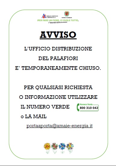 Amaie Energia e Servizi srl comunica la temporanea chiusura dell'ufficio distribuzione del Palafiori, precisando che il numero 800 310 042 rimarrà comunque attivo dal lunedì al sabato dalle 8 alle 14 per rispondere alle segnalazioni e richieste delle utenze. E’ altresì attiva la mail portaaporta@amaie-energia.it che può essere utilizzata per le medesime segnalazioni e/o richieste La redazione