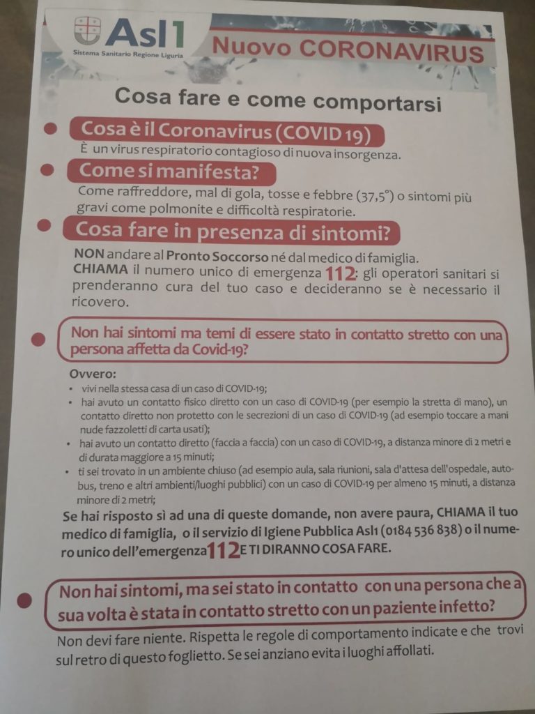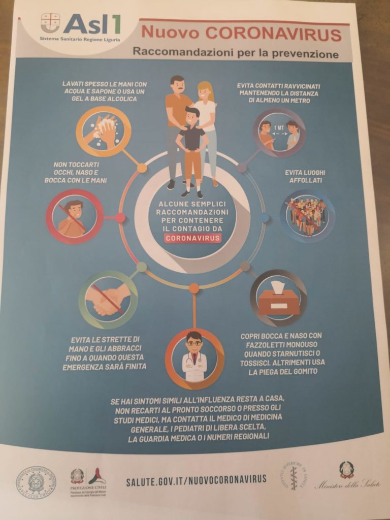 - dalla collaborazione Asl1 e Comune di Sanremo sono stati realizzati i primi 150 manifesti e 200 opuscoli informativi contenenti disposizioni e misure comportamentali da tenere, altri 10 mila sono pronti andare in stampa; obiettivo della campagna informativa è quello di raggiungere quante più persone possibili, in particolar modo quella fascia di popolazione ancora più legata ad una comunicazione più tradizionale;