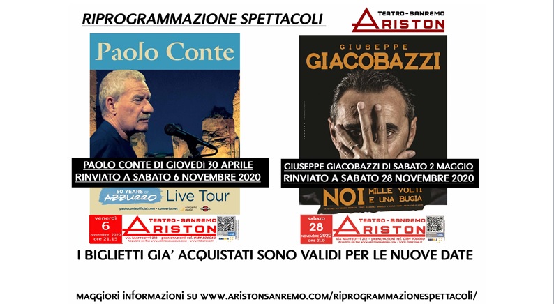 Si comunica la riprogrammazione degli spettacoli del Teatro Ariston come segue: