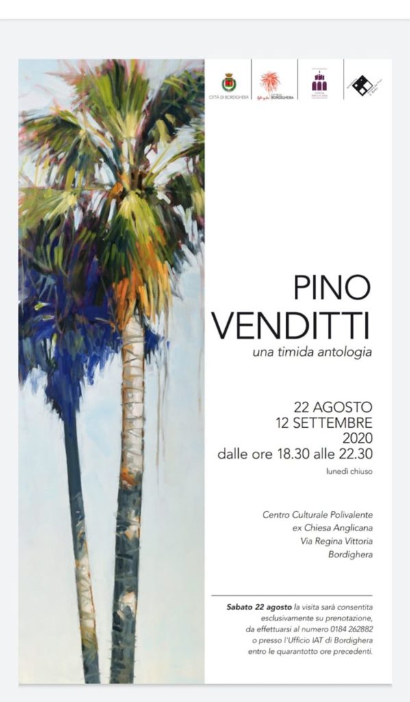 Da sabato 22 agosto a sabato 12 settembre, tutti i giorni tranne il lunedì, dalle ore 18.30 alle 22.30, Centro Culturale ex Chiesa Anglicana, mostra dell’artista Pino Venditti “Una timida antologia”.