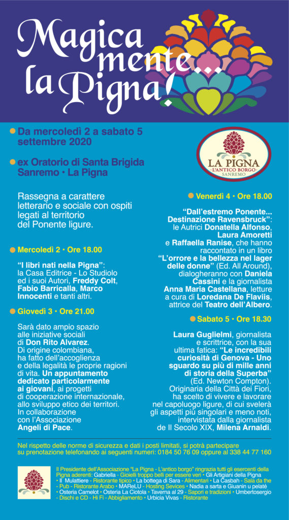 Continua l’iniziativa del CIV LA PIGNA ANTICO BORGO, impegnato nella promozione socio-culturale del centro storico, nella ex Chiesa di Santa Brigida a Sanremo, trasformata in centro culturale. La rassegna “Magicamente…la Pigna!” ha preso il via il 2 settembre e si svolgerà fino a sabato 5. Si tratta di un intenso programma di incontri a carattere letterario e sociale con ospiti legati al territorio del Ponente Ligure.