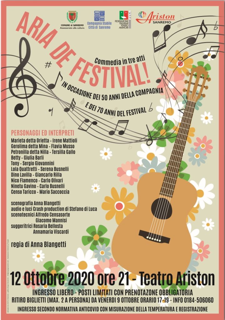 Lunedì 12 ottobre alle ore 21.00, per i festeggiamenti di San Romolo, la Compagnia Stabile Città di Sanremo presenta “Aria de Festival”, commedia in tre atti in occasione dei 50 anni della Compagnia e dei 70 anni del Festival.