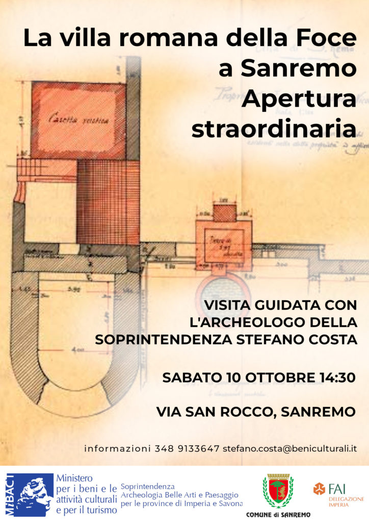 Domani (sabato 10 ottobre) il Ministero per i beni e le attività culturali e per il turismo (MiBACT) organizza una visita guidata gratuita alla Villa romana della Foce di Sanremo, uno dei siti archeologici statali di maggiore interesse dell’intera provincia.